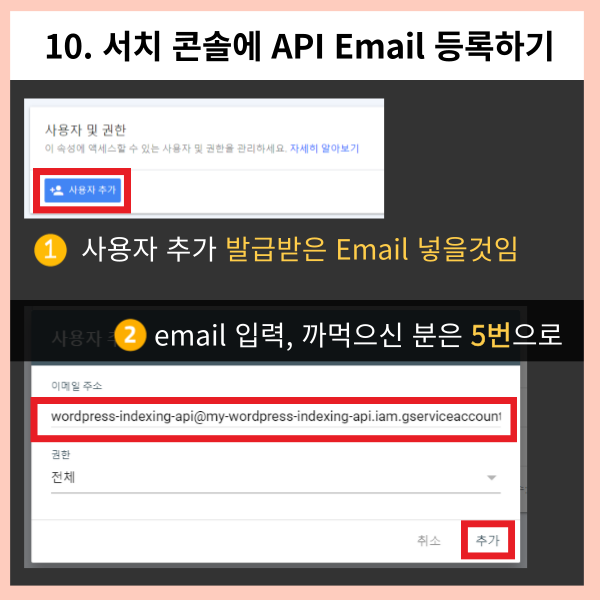 설정 > 사용자 및 권한 추가에서 여러분이 생성한 Service Account(서비스 계정)의 email 값을 넣어주시면 됩니다.