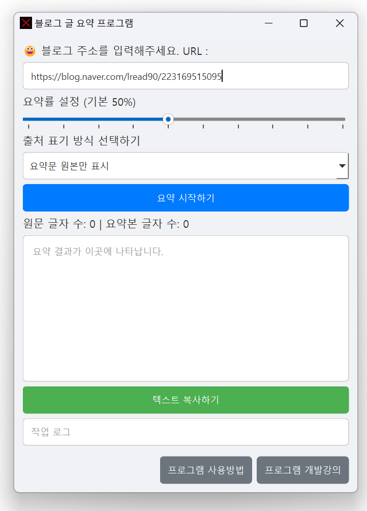 블로그 주소 입력, 요약률 조정, 출처 표기 방식 선택이 가능한 프로그램 GUI를 만듭니다.
