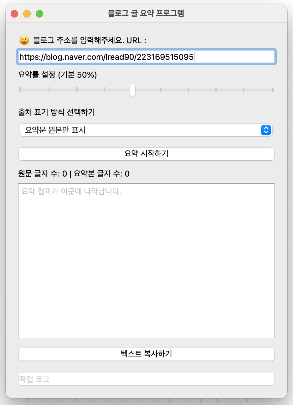 블로그 주소 입력, 요약률 조정, 출처 표기 방식 선택이 가능한 프로그램 GUI를 만듭니다.
