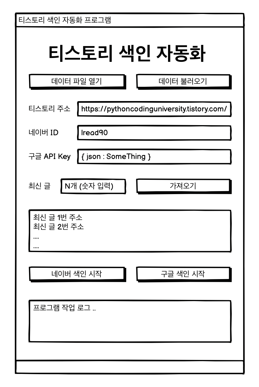 티스토리 색인 자동화 프로그램 왜 만드냐 ? 핫한 아이템들이 애드센스 블로그 운영인데애드센스 블로그 글 쓰는 사람들에게 도움되는 프로그램 만들어 보려고 ㅇㅇ 1. UI 기획하고 네이버 구