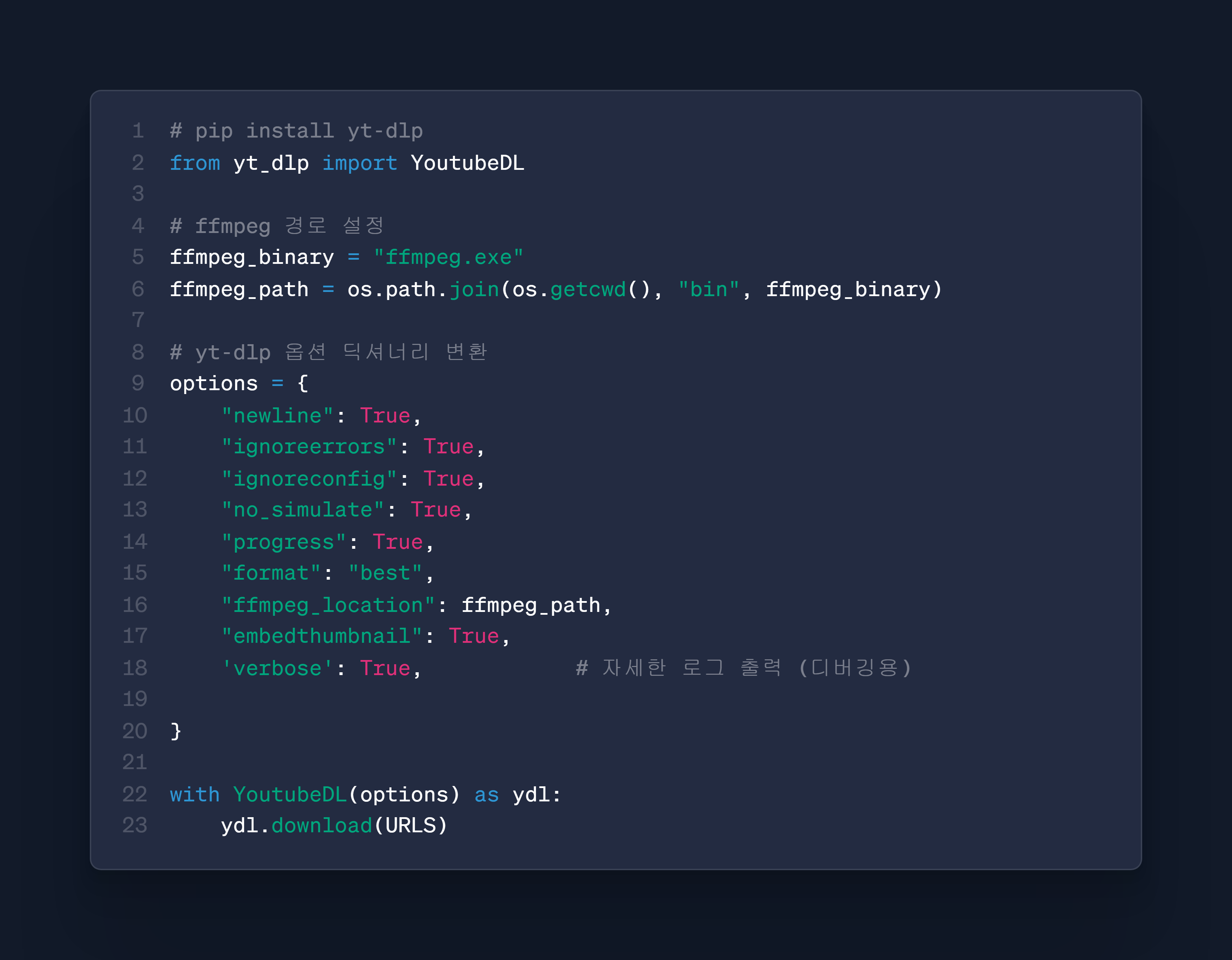 보통 yt-dlp는 커맨드 라인에서 많이 사용하지만, 파이썬 코드에서 직접 사용할 수도 있어!